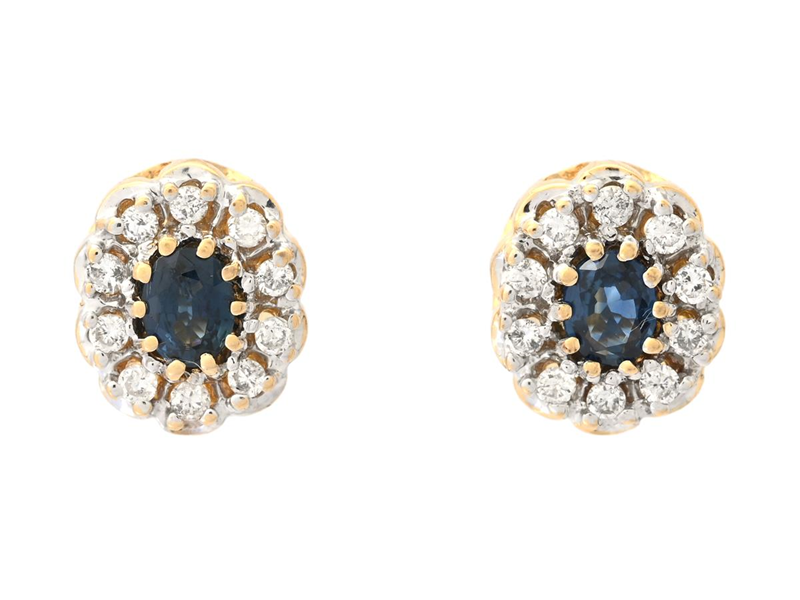 CLUSTER EARRINGS, 18K gold, oval faceted sapphires, 20 brilliant cut diamonds approx. 0,20 ctw, approx. TW/SI-P, pushback, measurements 9,0 x 7,5 mm, weight 3,3 g, some stones with surface defects.