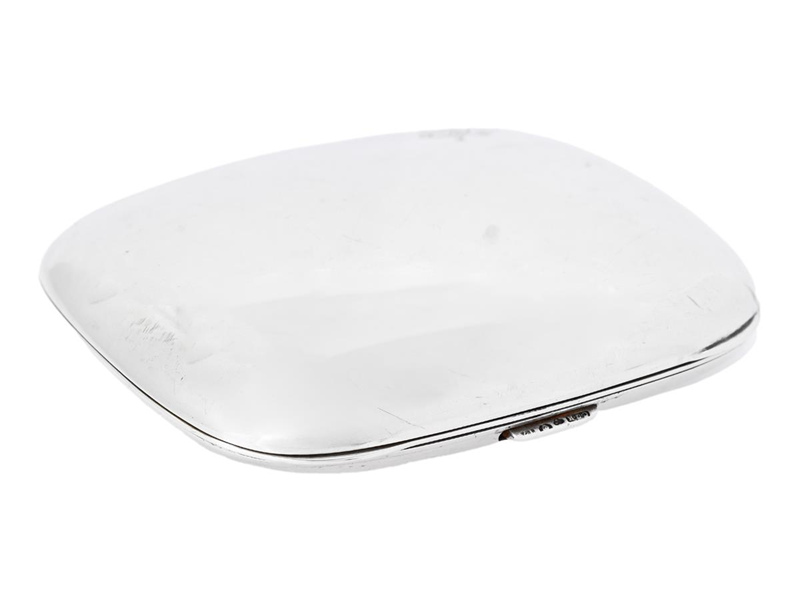 CIGARETTE CASE, silver, with hidden compartment, enamel painting with a naked woman, gilt interior, C.G. Hallberg, Stockholm 1911, 90x85 mm, weight 172,8 g, gilt with signs of wear, oxidizing, dents, damages on the enamel, monogram engraving.