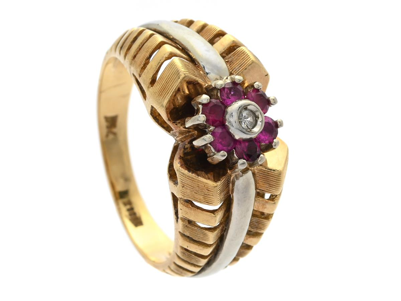 RING, 18K gold/white gold, rubies, white topaz, Ettore Morando, Italy, Alessandria, mid 20th century, size 18,25 mm, weight 6,6 g.