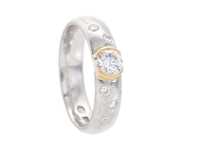 ENGELBERT, ring, 18K white gold/gold, brilliant cut diamonds 0,56 ctw according to engraving, of which the centre stone is approx. 0,43 ct, 2 eight-cut diamonds, size 18,0 mm, weight 7,8 g, in need of rhodium plating.