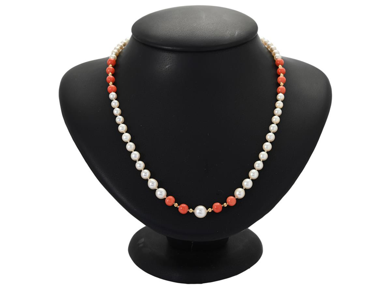 PEARL NECKLACE, 18K gold, cultured salt-water pearls approx. 4,4 mm, coral, clasp in 18K gold, length 72 cm,.