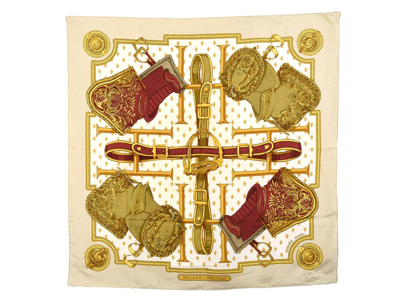 SCARF, HERMÈS, Selles a Housse, Christiane Vauzelles, 100% silk, red, gold, white, approx. 90x90 cm.