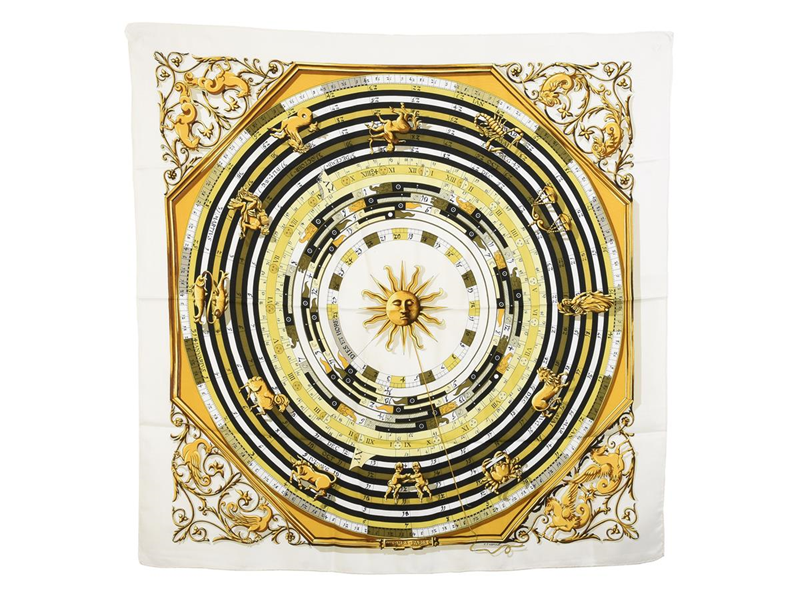 SCARF, HERMÈS, Dies Et Hore, F. Faconnet, 100% silk, 90x90 cm, beige, black, yellow, stain, case.
