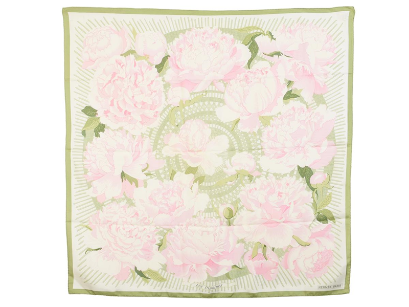SCARF, HERMÈS, Les pivoines, Christiane Vauzelles, 100% silk, 90x90 cm, white, light pink, green, case,