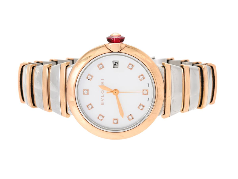 BVLGARI, Lucea Scaglie, Cal 220 TEEA, Serial no. PO 0698, Ref no. LUP 36 SG, unisex, 36 mm, stål/rosa gold, self winding, sapphire crystal, date, mother-of-pearl-dial with diamonds (12 pcs. 8/8), display caseback, integrerarad original bracelet, folding clasp, certificate, October 2018, box, paper box.