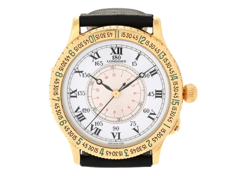 LONGINES, Charles Lindbergh, Replica of "Hour Angle Watch", Cal L628 (ETA 2892-2), Ref no. 989.5216, Case no. 26279179, men´s wristwatch, 38 mm, 18K gold, self winding, mineral crystal, enamel dial, damaged dial, defect (not working, needs overhaul), openable case back with crystal cuvett, leather strap, approx. 1990.