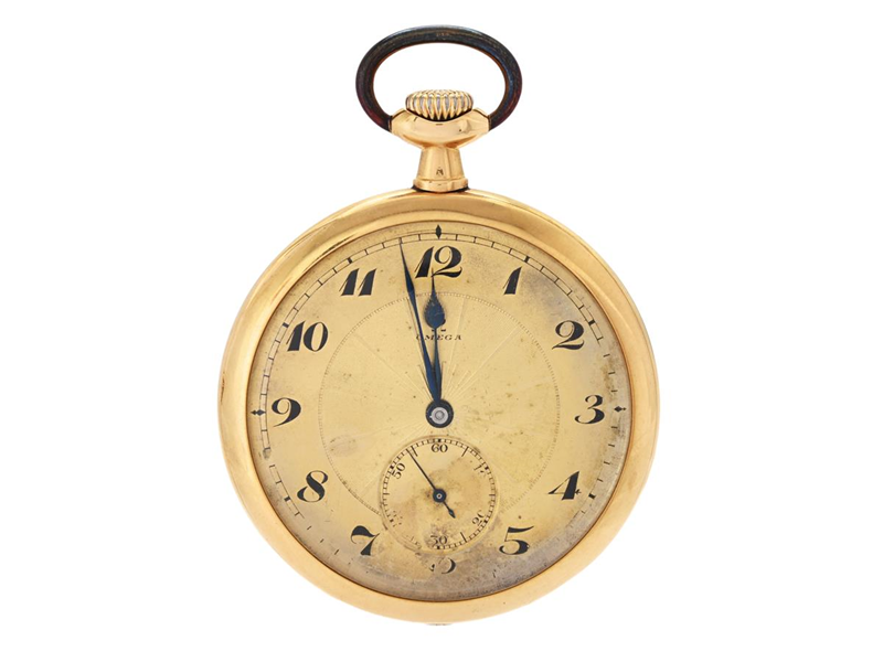 OMEGA, pocket watch, 49,5 mm, Serial no. 2013655, Case no. 5600363, 18K gold, lever escapement, damaged dial, cuvett in 18K gold, dents, approx. 1916, dustbag, case.