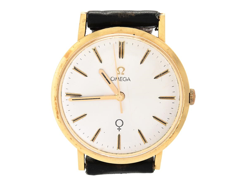 OMEGA, men´s wristwatch, 34 mm, Cal 601, Serial no. 27803437, Ref no. BA 131.541, Case no. 131.541/1181, 18K gold, manual winding, plastic crystal, date, logo on dial, damaged dial, engraving, damaged case (damaged lugs), leather strap, approx. 1968.