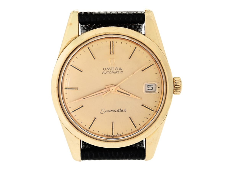 OMEGA, Seamaster, Cal 562, Serial no. 18839450, Ref no. KO 14701, Case no. 14701 61 SC (C.B), men´s wristwatch, 33,5 mm, gold on steel (damaged), self winding, plastic crystal, date, damaged dial, defect (not working, needs overhaul), leather strap, approx. 1961.