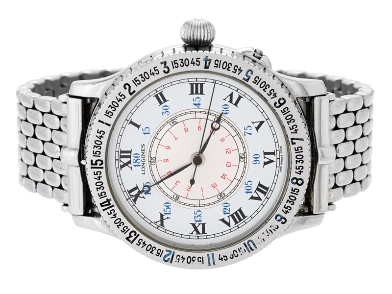 LONGINES, Hour Angle Watch, designed of Charles Lindbergh, Cal L989.2, Serial no. 57710153, Ref no. 989.5215, Case no. 24369197, men´s wristwatch, 38 mm, steel, self winding, mineral crystal, openable case back with glass cuvett, engraving, original bracelet, approx. 1992.