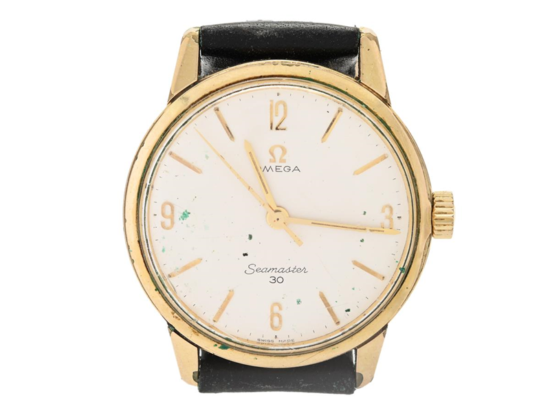 OMEGA, Seamaster 30, Cal 286, Serial no. 20786707, Ref no. JD 135.007, Case no. 135.007-63, men´s wristwatch, 35 mm, gold plated (damaged, 40 micron), manual winding, plastic crystal, damaged dial, leather strap, approx. 1963.