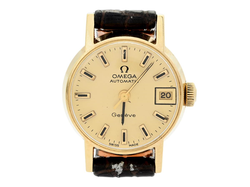 OMEGA, Genève, Cal 681, Serial no. 31123905, Ref no. BA 562.016, Case no. 562.016, ladies´ wristwatch, 20,5 mm, 18K gold, self winding, plastic crystal, date, leather strap, approx. 1969.