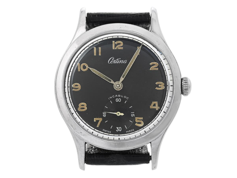 CERTINA, "Incabloc", Cal K.F. 320, Ref no. 8720-1, Case no. 1540517, men´s wristwatch, 35,5 mm, steel, manual winding, plastic crystal, small seconds hand, damaged dial, needs overhaul, leather strap, approx. 1955.