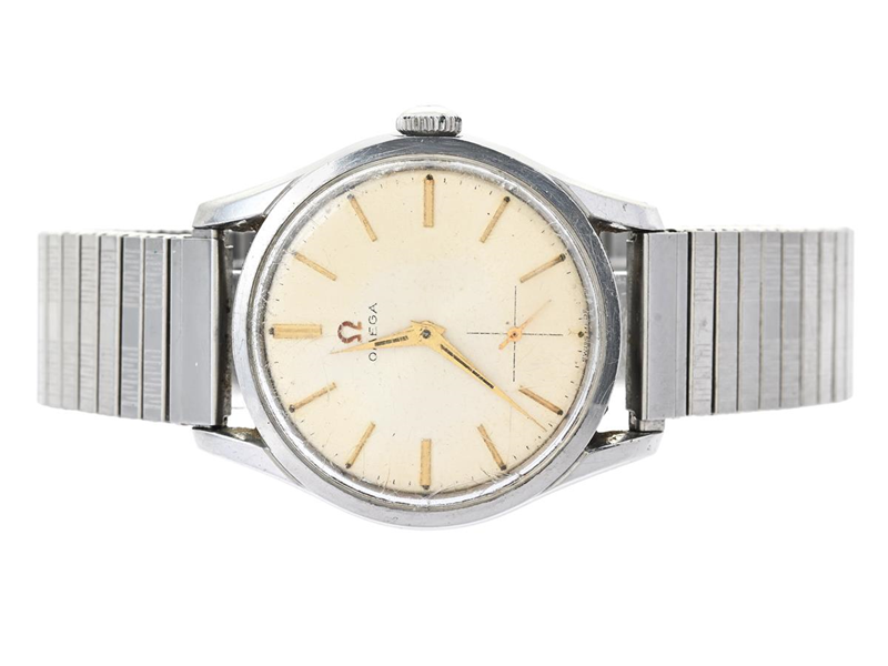 OMEGA, men´s wristwatch, 36 mm, Cal 266, Serial no. 13656114, Ref no. CK 2639, Case no. 2639-13, steel (Staybrite), manual winding, plastic crystal, small seconds hand, damaged dial, approx. 1953, metal bracelet not original.