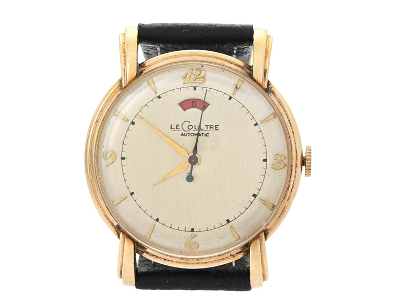 LE COULTRE, "Powerwind", Cal 481 (VXN), Serial no. 604918, Case no. 8431, men´s wristwatch, 34 mm, gold plated (10K goldfilled), bumper automatic, plastic crystal, power reserve indicator, restored dial, damaged dial, leather strap, approx. 1949.