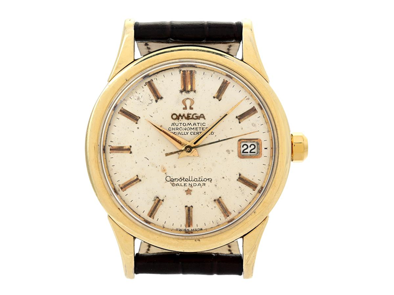 OMEGA, Constellation, Calendar, Chronometer, Cal 504, Serial no. 16725571, Ref no. KO 2943, Case no. 2943 5 SC, men´s wristwatch, 35 mm, gold on steel, self winding, plastic crystal, date, damaged dial, leather strap, approx. 1958.