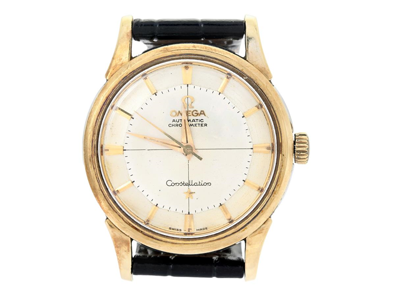 OMEGA, Constellation, Chronometer, s.c. "Pie-Pan", Cal 551, Serial no. 18215131, Ref no. KO 14381, Case no. 14381 11 SC (C.B), men´s wristwatch, 34 mm, gold on steel, self winding, plastic crystal, damaged dial, leather strap, approx. 1961.