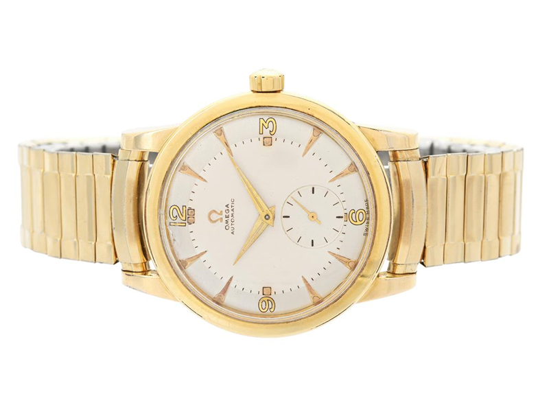 OMEGA, Seamaster, Cal 332, Serial no. 12155196, Ref no. DW 2493, Case no. 2493-4 (HF), men´s wristwatch, 36 mm, gold plated (80 micron), bumper automatic, plastic crystal (damage), small seconds hand, defect (needs overhaul), leather strap, approx. 1950.