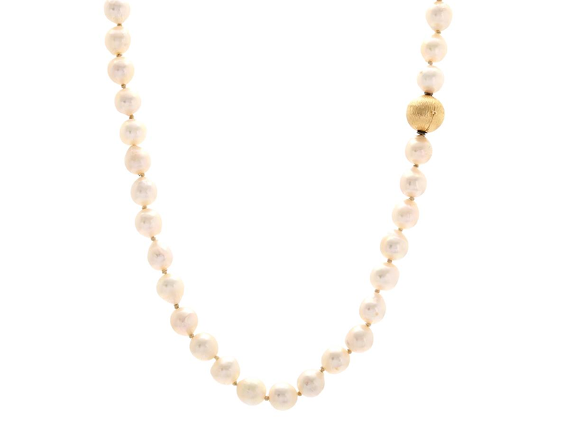 OLE LYNGGAARD, clasp, 18K gold, diameter 10,5 mm, weight 2,8 g, pearl necklace, cultured pearls approx. 7-8 mm, off round, length 40 cm, cap ends.