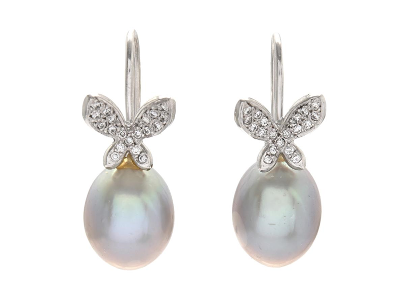 EARRINGS, butterflies, 18K white gold, cultured freshwater pearls approx. 13,5x10,5 mm, brilliant cut diamonds approx. 0,19 ctw, approx. TW-TCr/VS, height 27 mm, weight 6,8 g, hooks.