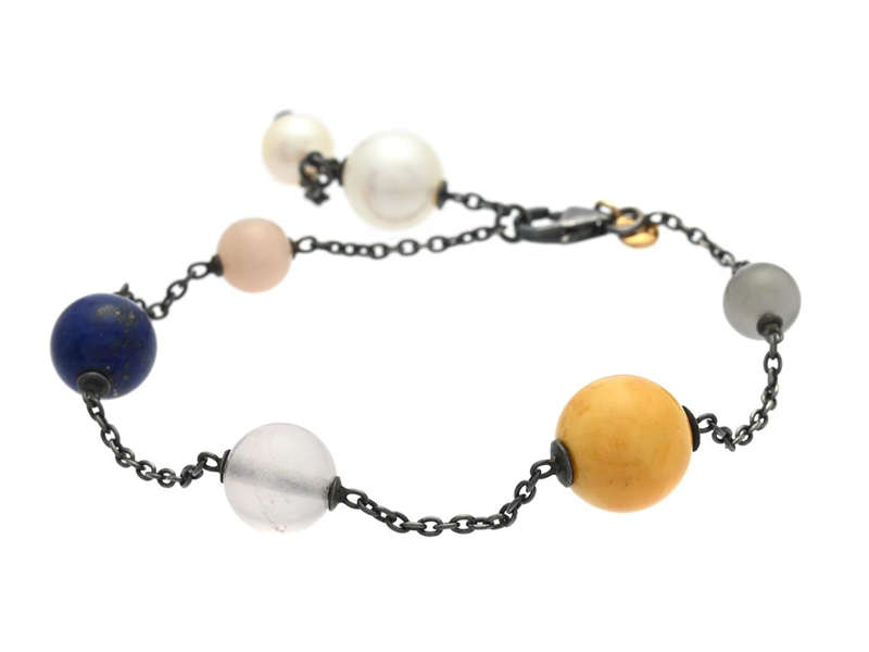 OLE LYNGGAARD, bracelet, Circus, oxidised sterlingsilver/18K gold, lapis lasuli, pearls, amber, moonstone, length 16/18 cm, weight 5,2 g, box.