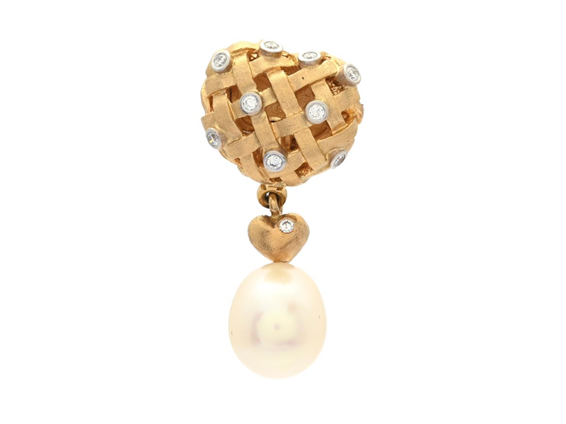 OLE LYNGGAARD, clasp, Twined Heart, 18K gold, 9 brilliant cut diamonds approx. 0,12 ctw, Charlotte Lynggaard, key-pendant, brilliant cut diamond approx. 0,02 ct, cultured freshwater pearl, height 34 mm, weight 9,1 g.