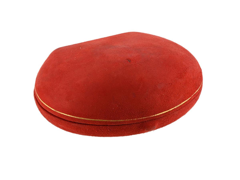 BOX, for Omega ladies´ wristwatch, red, 95 x 80 x 40 mm, damaged, approx. 1965.