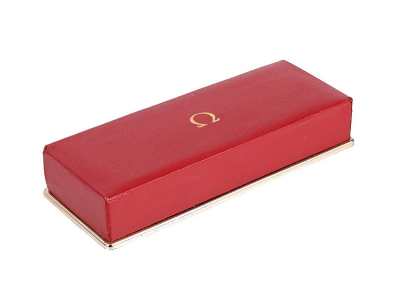 BOX, for Omega wristwatch, red, 139 x 54 x 26 mm, damaged, approx. 1975.