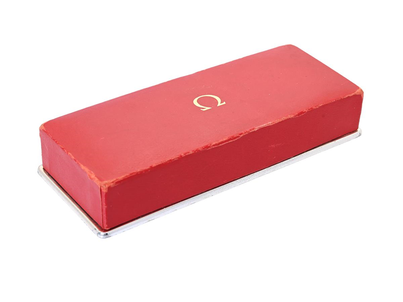 BOX, for Omega wristwatch, red, 142 x 58 x 26 mm, damaged, approx. 1975.