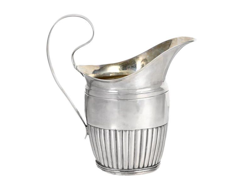 CREAM JUG, silver, partly gilt, godrooning, handle, Petter Adolf Sjöberg, Stockholm 1823, height 12,5 mm, weight 113,9 g, on the bottom coat of arms family Von Düben, dents.