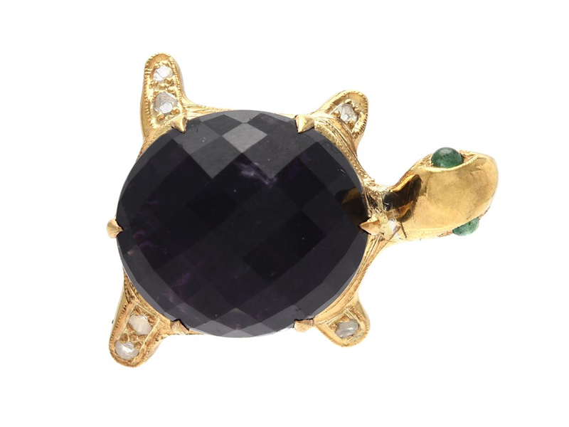 BROOCH, gilt sterling silver/9K gold, faceted amethyst, emerald, diamonds with some faceted surfaces, turtle, measurements 25x30 mm, weight 5,5 g.