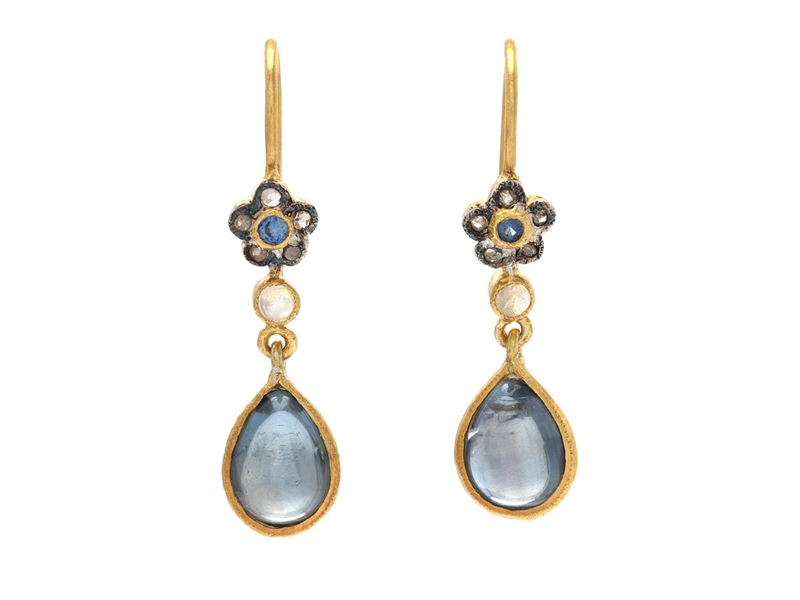 EARRINGS, gilt sterling silver, rose cut diamonds, moonstone, tanzanite, sapphire, length 28 mm, weight 2,0 g.