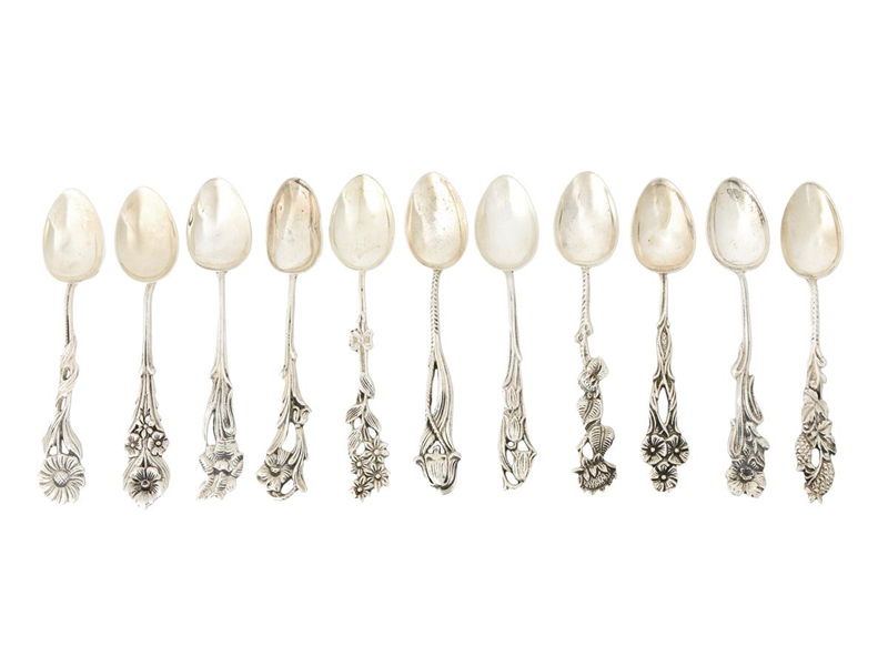 SMALL COFFEE SPOONS, silver, 11 pieces, motif with different flowers, length 10 cm, weight 98,5 g.