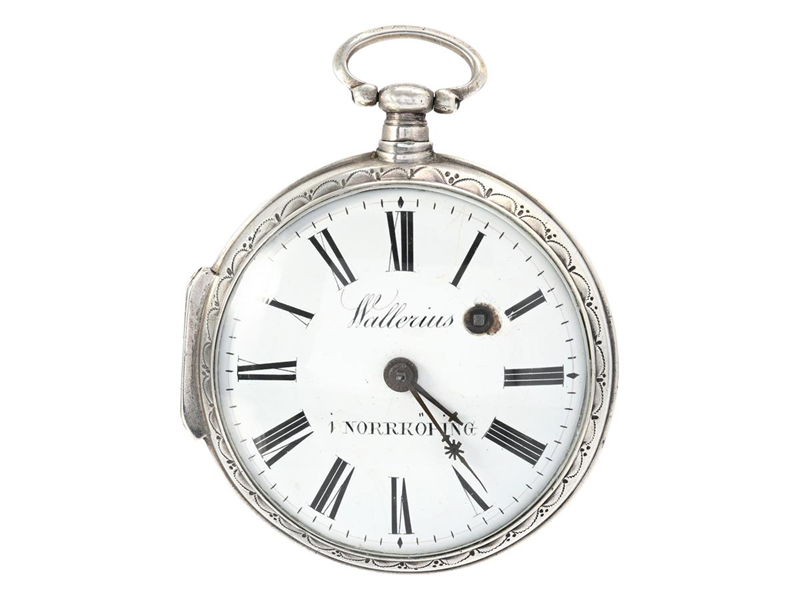 POCKET WATCH, "Wallerius i Norrköping", 60 mm, white metal, verge escapement, key wind, damaged dial, dents, approx. 1820.