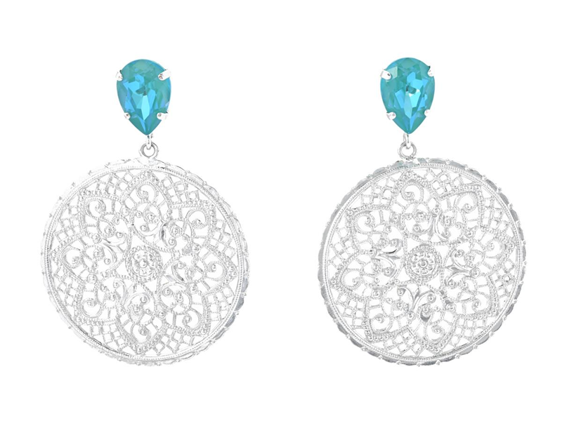 CAROLINE SVEDBOM, Alexandra earrings, rhodium plated brass, blue Swarovski crystals, length 5,5 cm, pushback, case, weight 13,2 g.