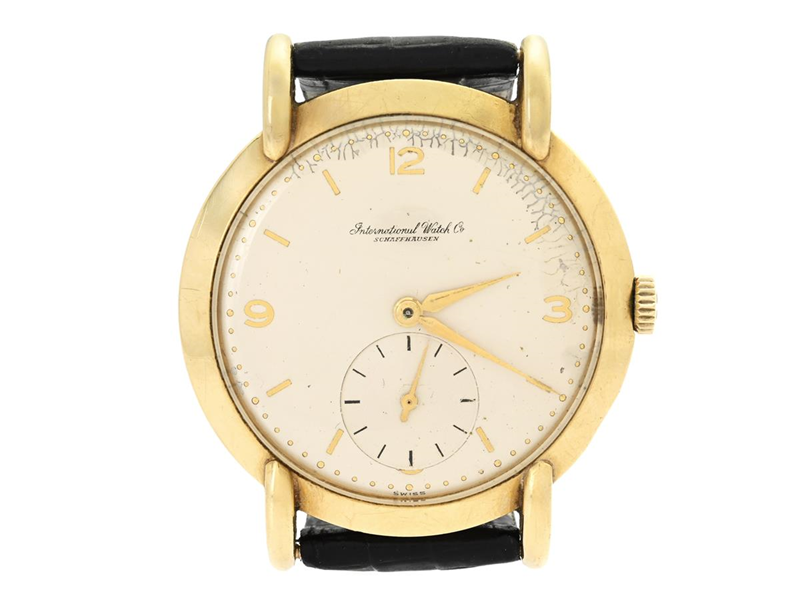 IWC, men´s wristwatch, Cal 88 (Inca), Serial no. 1154868, Case no. 1232926, 18K gold, manual winding, plastic crystal (damaged), small seconds hand, damaged dial, engraving, dents, approx. 1948, box.