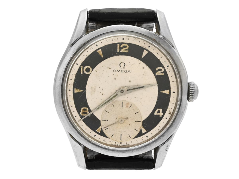 OMEGA, men´s wristwatch, 36 mm, Cal 266, Serial no. 13279566, Ref no. CK 2639, Case no. 2639-12, steel (Staybrite), manual winding, plastic crystal, small seconds hand, damaged dial (missing lume), leather strap, approx. 1952.