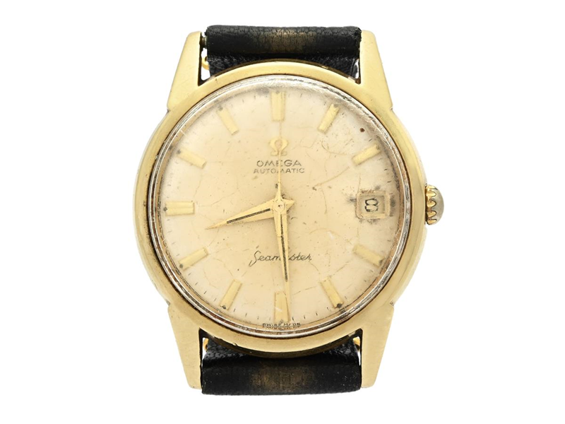 OMEGA, Seamaster, Cal 562, Serial no. 19443507, Ref no. KO 14760, Case no. 14760-61 SC (HF), men´s wristwatch, 34 mm, gold on steel (Staybrite), self winding, plastic crystal, date, damaged dial, defect (needs overhaul), leather strap, approx. 1962.