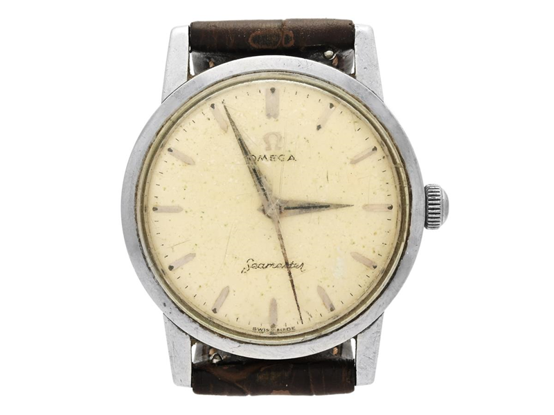 OMEGA, Seamaster, Cal 600, Serial no. 18618419, Ref no. CK 14759, Case no. 14759 SC-61 (SGR), men´s wristwatch, 33 mm, steel, manual winding, plastic crystal, damaged dial/hands, defect (not working, needs overhaul), leather strap, approx. 1961.