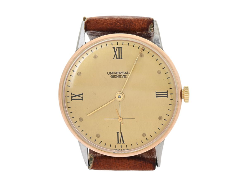 UNIVERSAL, Geneve, Cal 264, Movement no. 164903, Case no. 801419 / 20925, men´s wristwatch, 32 mm, steel (Enversteel)/pink gold, manual winding, plastic crystal, small seconds hand, restored dial, damaged dial, leather strap, approx. 1950.