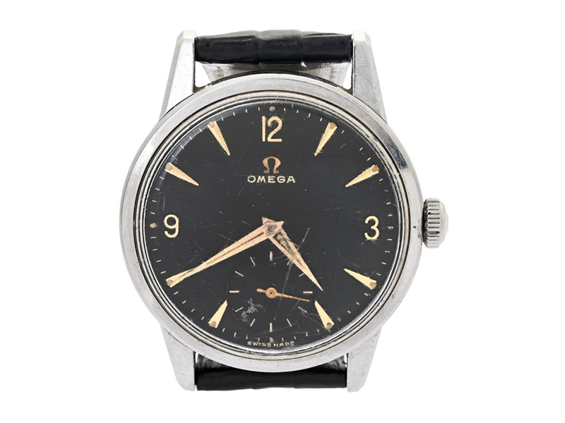 OMEGA, men´s wristwatch, 35 mm, Cal 268, Serial no. 1704730, Ref no. CK 14389, Case no. 14389-1, steel. manual winding, plastic crystal, small seconds hand, damaged dial, leather strap, approx. 1959.