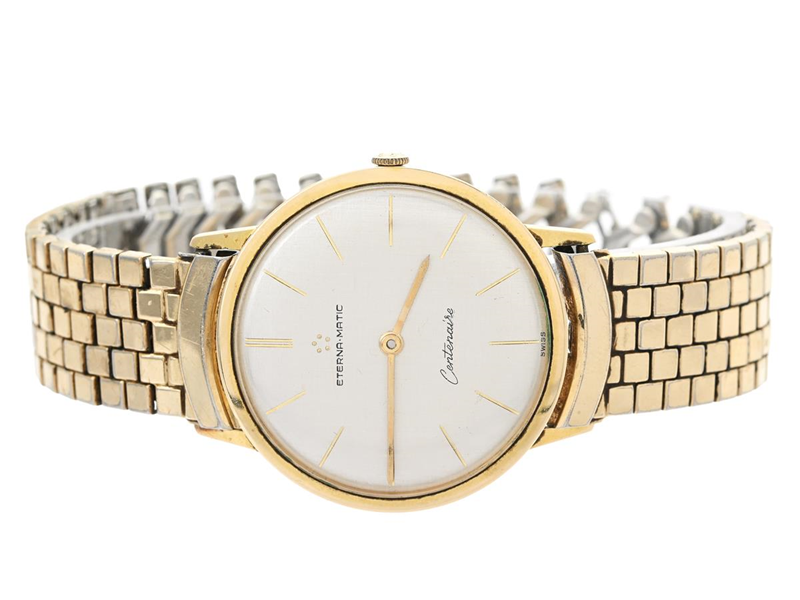 ETERNA-MATIC, Centenaire, Cal 1429U, Serial no. 4458159, Case no. 4392689, men´s wristwatch, 34,5 mm, gold plated (80 micron), self winding, plastic crystal, needs overhaul, approx. 1960, bracelet in yellow metal not original (damaged).