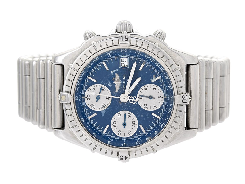 BREITLING, Chronomat, "Tachymeter", Cal 13 (ETA 7750), Serial no. 17986, Ref no. A13050.1, chronograph, men´s wristwatch, 39 mm, steel, self winding, sapphire crystal, date, replaced hand (Luminova), damaged dial/hands, defect (not working, see detailed info), Rouleaux bracelet, folding clasp, approx. 1997.
