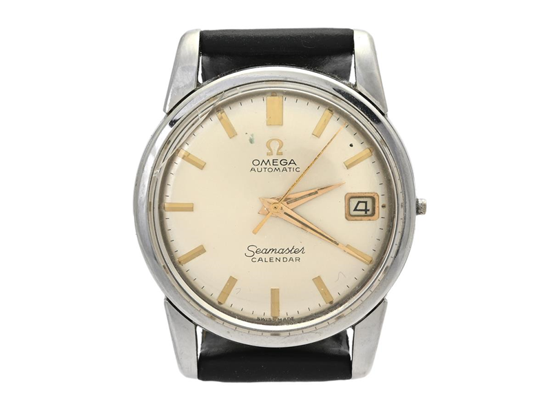 OMEGA, Seamaster, Calendar, Cal 503, Serial no. 14896968, Ref no. CK 2849 , Case no. 2849 2 SC, men´s wristwatch, 34 mm, steel, self winding, plastic crystal (damaged), date, defect (needs overhaul), missing crown/setting stem, leather strap, approx. 1955.