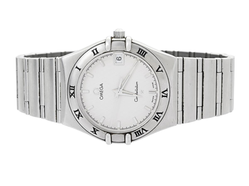 OMEGA, Constellation, ´95, Cal 1532, Serial no. 56135262, PIC no. 1512.30.00, Ref no. ST 396.1201, Case no. 396.1201, men´s wristwatch, 33,5 mm, steel, quartz, sapphire crystal, date, integrated original bracelet, folding clasp, Ref no. 1552/862, approx. 1998, box, paper box.