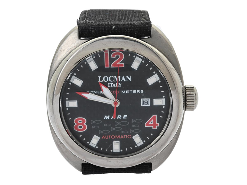 LOCMAN, Italy, Mare (Titanium 100 Meters), Cal Miyota, Serial no. 1999, Ref no. 131, men´s wristwatch, 47 mm, titanium, self winding, mineral crystal, date, cordura strap, original buckle, approx. 2006, case.