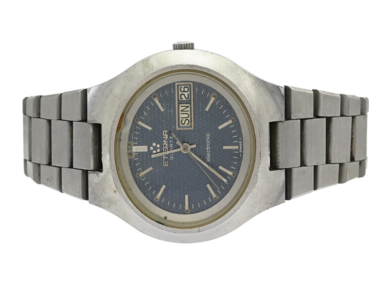 ETERNA, Electronic, Case no. 7071003 / 105 TB, men´s wristwatch, 41 mm, steel, quartz, mineral crystal (damaged), day, date, damaged dial, integrated original bracelet, length 195-200 mm, approx. 1975.