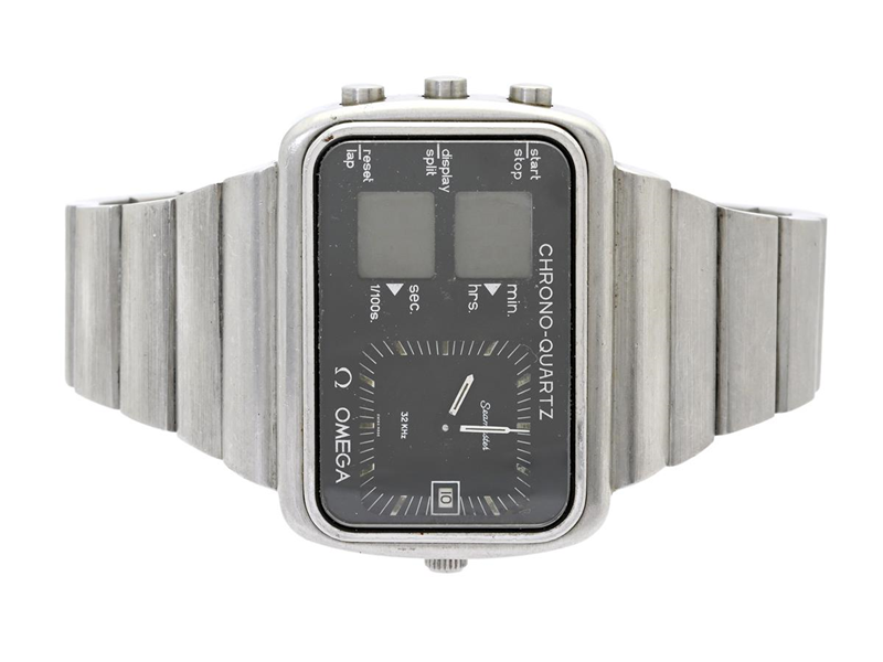 OMEGA, Seamaster, Chrono-Quartz, s.c. "Albatros", Cal 1611, Serial no. plaket with serial number missing, Ref no. ST 396.0839, Case no. 196.0052 / 396.0839 (S.F), men´s wristwatch, 46,7 x 34 mm, analog/digital, steel, quartz, sapphire crystal, date, damaged dial, defect (not working, needs overhaul), integrated original bracelet, folding clasp, Ref no. 1277/212, approx. 1978.