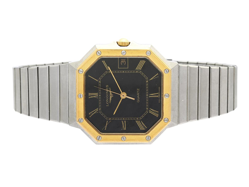LONGINES, men´s wristwatch, 33 mm, Cal 950, Serial no. 54994720, Case no. 20123276/4898/950 (K.B), bicolour, quartz, mineral crystal, date, damaged dial, defect (not working, needs overhaul), integrated original bracelet i steel, folding clasp, approx. 1990.