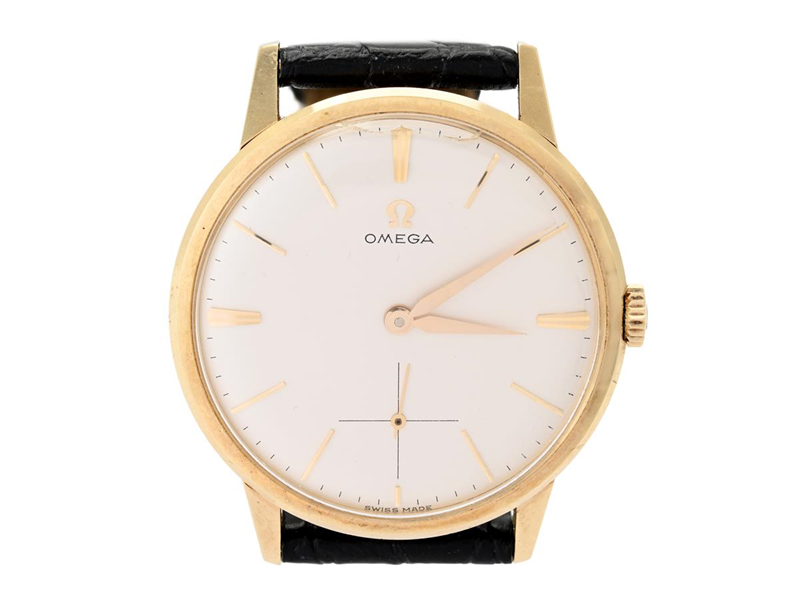OMEGA, men´s wristwatch, 34 mm, Cal 268, Serial no. 18385363, Ref no. BD 14715, Case no. 14715 4, 14K gold, manual winding, plastic crystal (damaged), small seconds hand, leather strap, approx. 1961, box.